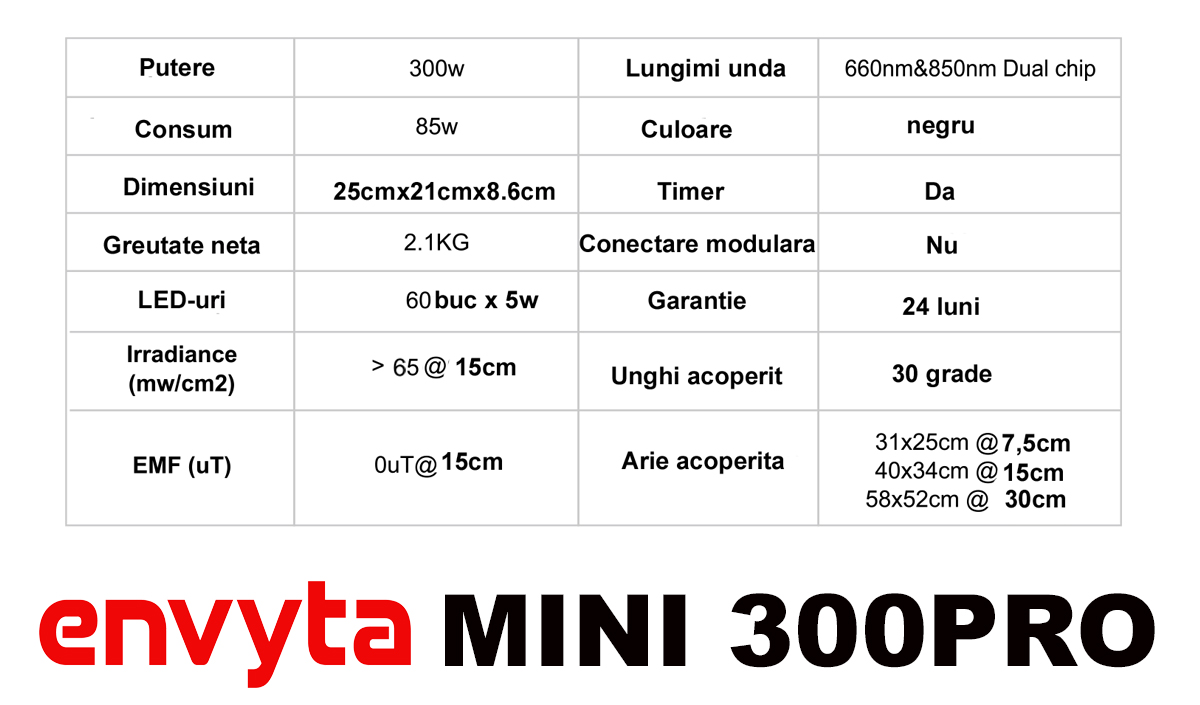 Envyta Mini 300W este un dispozitiv cu 60 LED-uri x 5W DualChip pe lungimile de undă: roșu (RED 660NM) si infraroșu (NIR 850NM).